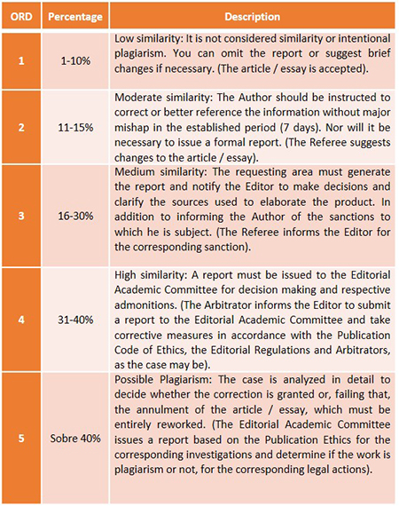 A pesar de que estos criterios de valoración de similitud están sujetos a modificación por gestión autónoma del área requirente, se estima que en porcentajes de similitud altos, se comunique obligatoriamente a las autoridades y se realice un llamado de atención correspondiente con el fin de dar cumplimiento a un nivel óptimo y real de la calificación del artículo/ensayo.